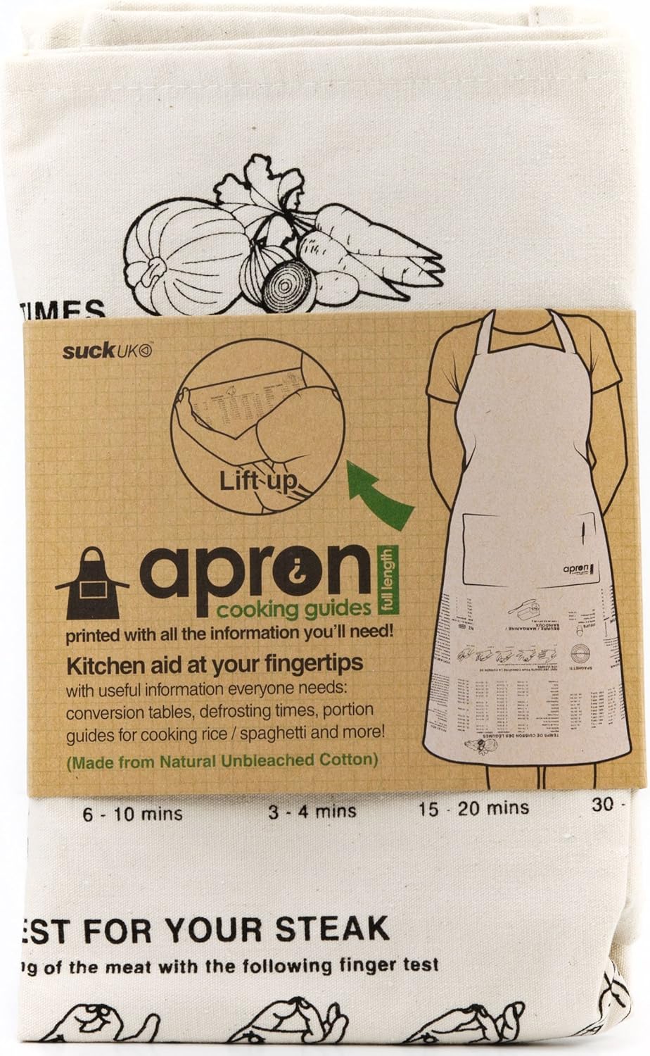 What a clever idea! An apron printed with everything you need to know to help you cook! This amazing apron is full of useful information including cooking times for vegetables, roasting times for birds, numeric conversions, freezing instructions, defrosting times, a cooking glossary and so much more! This is a long apron ideal for tall people.
